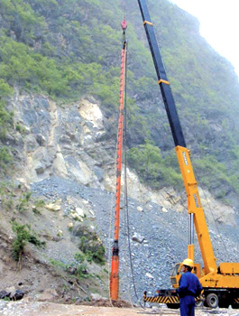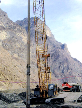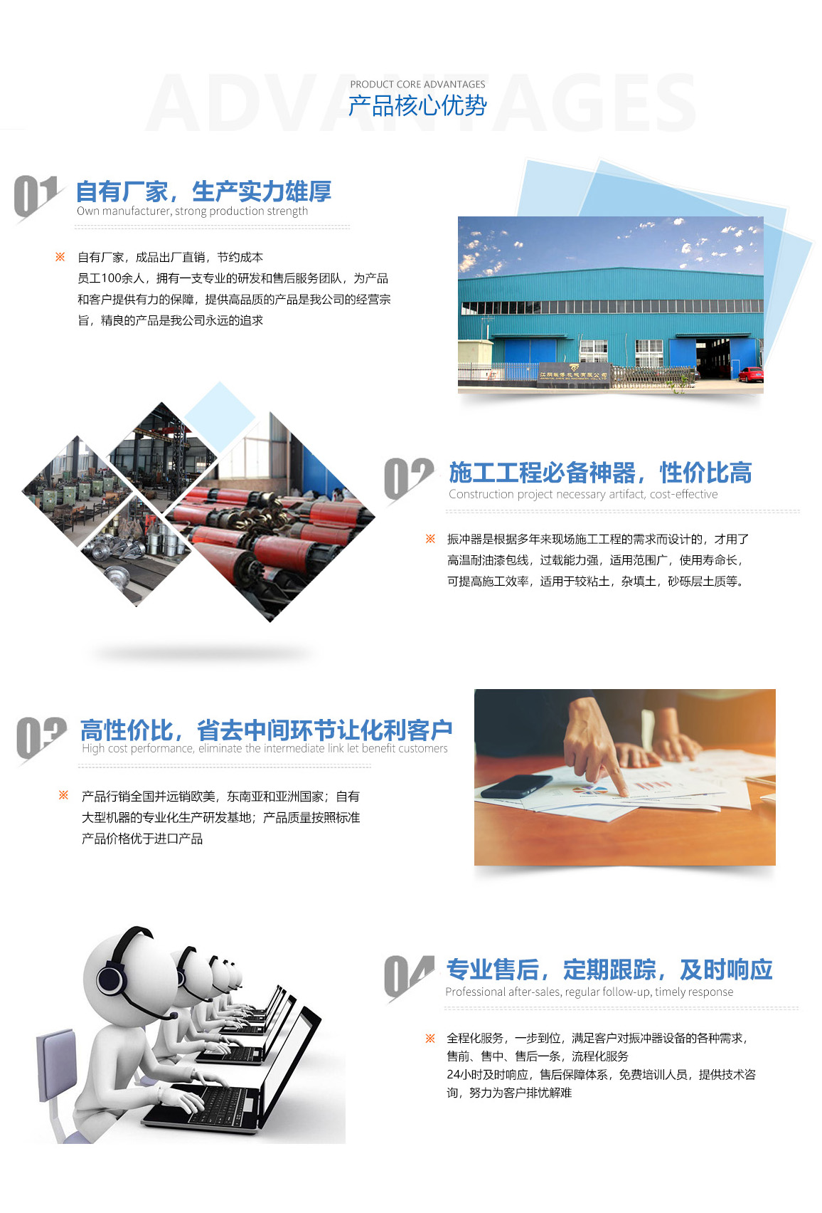振沖器是振沖法施工中的特制機具。它產(chǎn)生水平向振動力振擠填料及周圍土體,而達到提高地基承載能力、減少沉降量、增加地基穩(wěn)定性、提高抗地震液化能力。 振沖法施工時除原地沖器外,尚需行走式起吊裝置,泵送輸水系統(tǒng),控制操作臺等。如工程單位缺乏起重機,本廠還供應振沖器施工樁架,樁架有單邊滾管立柱式、液壓步履式、簡易履帶式等。